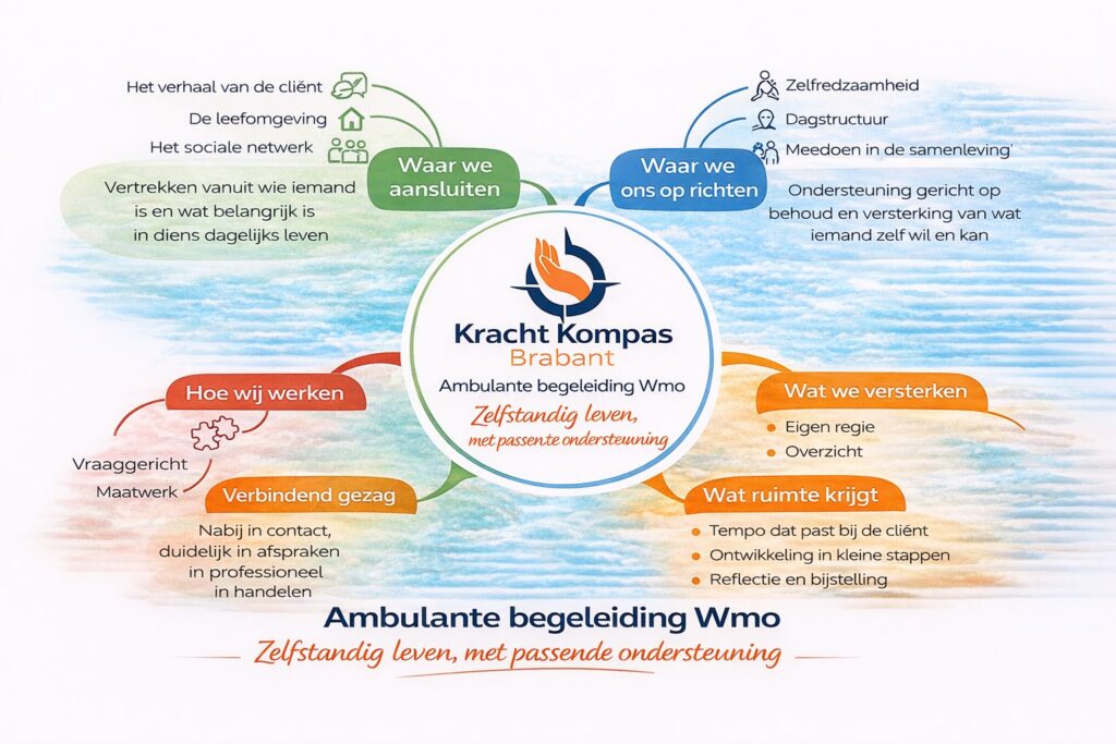 Ambulante begeleiding Wmo bij Kracht Kompas Brabant betekent samenwerken aan een dagelijks leven dat hanteerbaar en passend blijft. We sluiten aan bij wat iemand zelf wil behouden, versterken of veranderen.